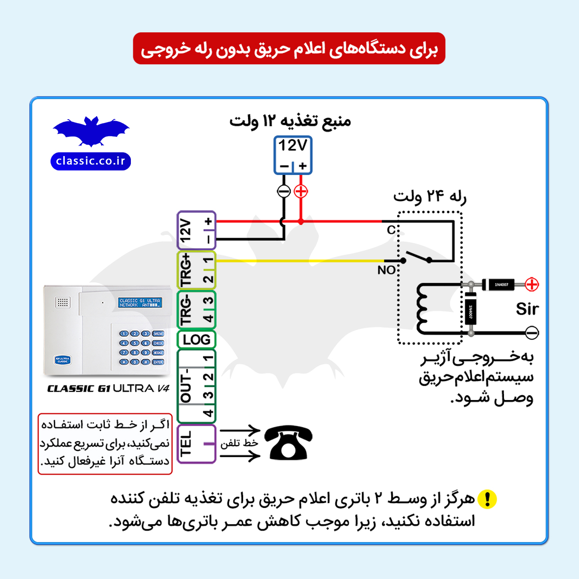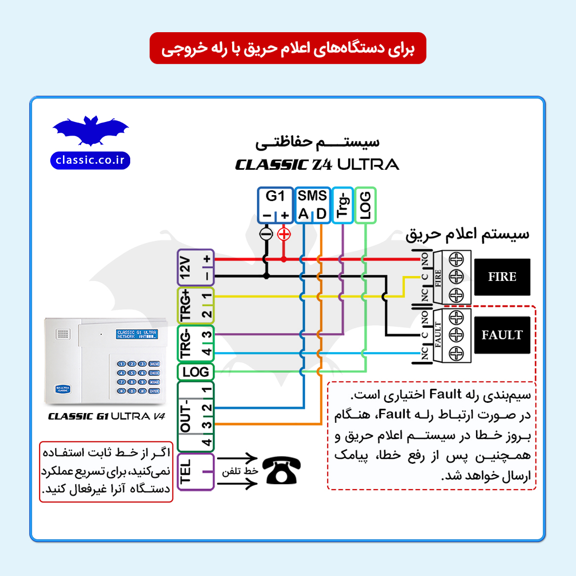 از تلفنکننده کلاسیک G1Ultra میتوان برای اعلام آژیر و همچنین بروز خطا (Fault) در سیستم اعلام حریق استفاده کرد. G1 Ultra میتواند به طور مستقل به سیستم اعلام حریق وصل شود یا به طور همزمان به دزدگیر و سیستم اعلام حریق متصل باشد. بسته به اینکه سیستم اعلام حریق رله خروجی داشته باشد، چهار سیمبندی زیر پیشنهاد میشود: